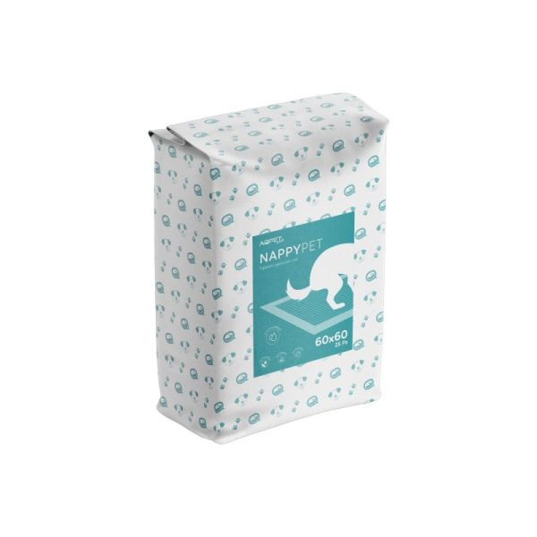 Nappy Pet Basic targati Aqpet, sono dei tappetini assorbenti igienici, adatti per tutti i cani quando non si ha la possibilità di portarli fuori per i loro bisogni e/o per cani incontinenti. Confezione convenienza sottovuoto da 25 pz.