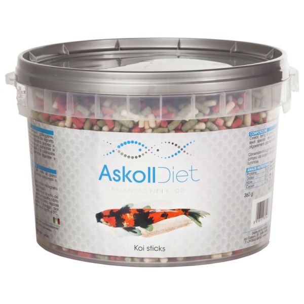 Askoll Diet Sticks è un alimento completo galleggiante per pesci ornamentali da laghetto, arrichito con Spirulina, paprika e germe di grano per aumentare le difese immunitarie dei pesci.