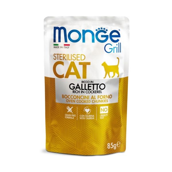 Bocconcini in gelatina caratterizzati da una consistenza soda e un piacevole aroma tipico di pollo. Il galletto italiano, come principale ingrediente, è una fonte proteica povera in grasso e colesterolo. È anche una eccellente fonte di Vitamine del complesso B, ferro, zinco e selenio. La specifica formulazione alta in proteine e ridotta in grassi* aiuta a mantenere una normale condizione corporea nei gatti sterilizzati proni a sviluppare sovrappeso o obesità. La ricetta è stata inoltre sviluppata senza l’utilizzo di cereali.