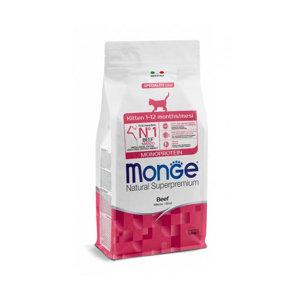 Monge Natural Superpremium Monoprotein* Kitten Manzo è un alimento completo e bilanciato per gattini. Specificatamente sviluppato per il benessere del tuo gattino grazie alla presenza di olio di microalga (Schizochytrium sp.) fonte di DHA per il sistema nervoso e visivo e taurina per il corretto sviluppo cardiaco. Prodotto formulato con un’unica fonte proteica animale*, il manzo, primo ingrediente, e con l’inclusione di carne fresca per una digeribilità e appetibilità ottimale. La formulazione è arricchita con XOS (Xilooligosaccaridi), prebiotici di ultima generazione che supportano il benessere intestinale. L’inclusione di ingredienti ricercati, come la rosa canina con componenti antiossidanti per poter contribuire a neutralizzare i radicali liberi e la yucca schidigera per il controllo degli odori intestinali, è frutto della ricerca Made in Italy per supportare la qualità di vita dei nostri gatti. Senza coloranti e conservanti artificiali aggiunti.