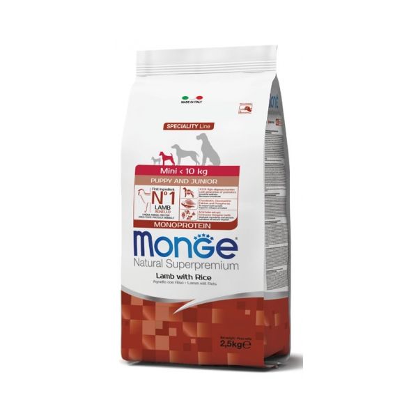 Monge Natural Superpremium Mini Puppy and Junior Monoprotein* Agnello con Riso è un alimento completo per cani cuccioli di taglia mini.