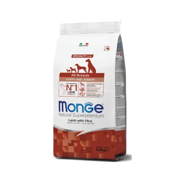 Monge Natural Superpremium All breeds Puppy and Junior Agnello con Riso è un alimento completo per cani cuccioli di tutte le taglie.