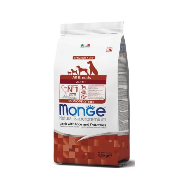 Monge Natural Superpremium All breeds Adult Monoprotein* Agnello con riso e patate è un alimento completo per cani adulti di tutte le taglie.
