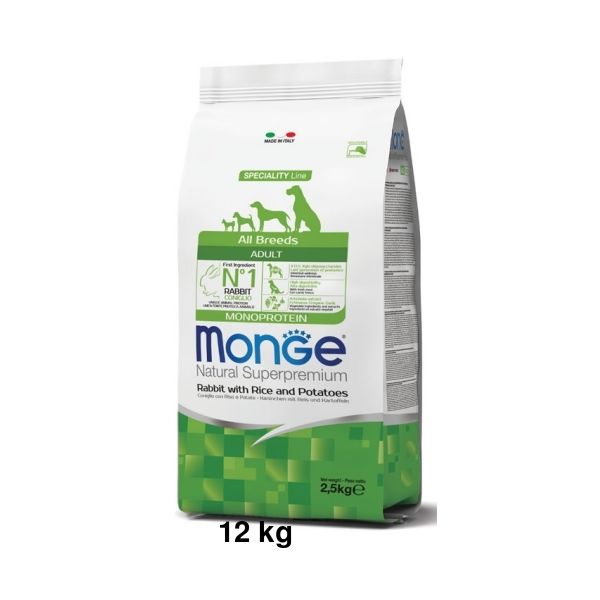 Monge Natural Superpremium All breeds Adult Monoprotein* Coniglio con Riso e Patate è un alimento completo per cani adulti di tutte le taglie.