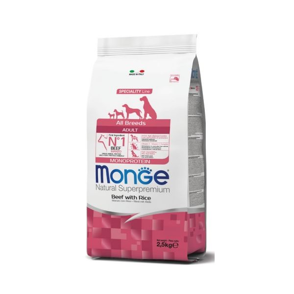 Monge Natural Superpremium All breeds Adult Monoprotein* Manzo con Riso è un alimento completo per cani adulti di tutte le taglie.