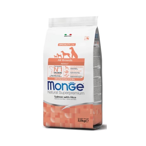 Monge Natural Superpremium All breeds Adult Monoprotein* Salmone con Riso è un alimento completo per cani adulti di tutte le taglie.