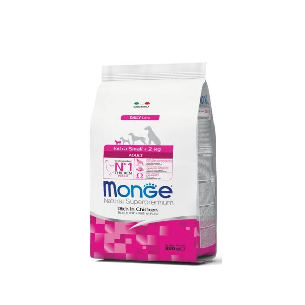 Monge Natural Superpremium Extra Small Adult Ricco in Pollo è un alimento completo per cani adulti di taglia extra small (<2 kg).