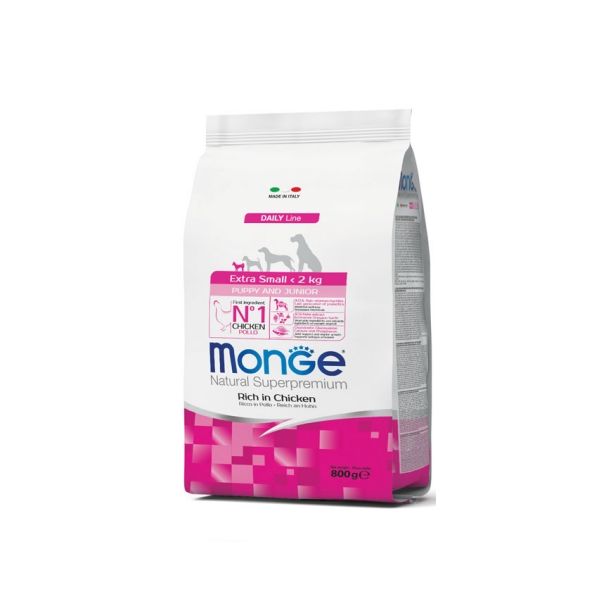 Monge Natural Superpremium Extra Small Puppy and Junior Ricco in Pollo è un alimento completo per cani cuccioli di taglia extra small (<2 kg).