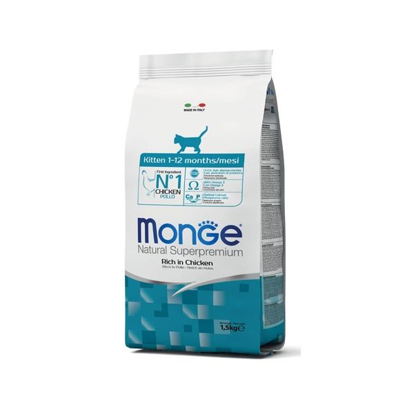 Monge Natural Superpremium Gattini Ricco in Pollo è un alimento completo per gattini dallo svezzamento al compimento del primo anno di età e per gatte in gravidanza e/o lattazione.