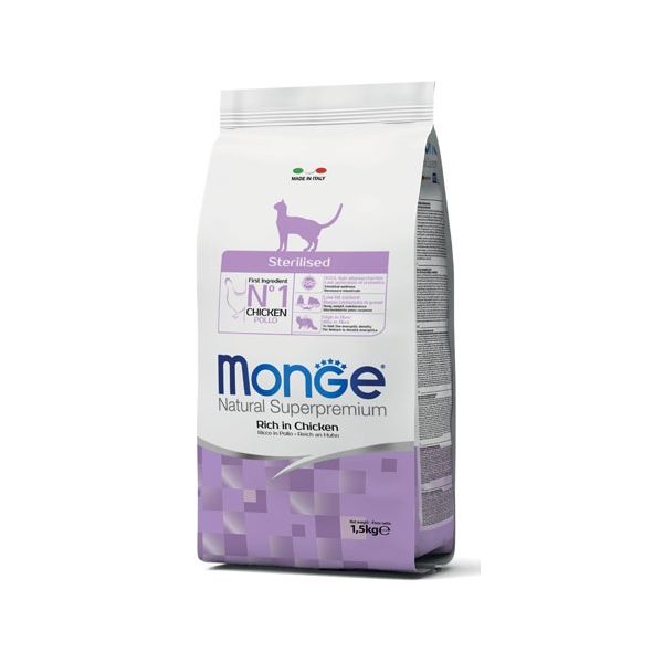 Monge Natural Superpremium Sterilizzato Ricco in Pollo è un alimento completo per gatti adulti.