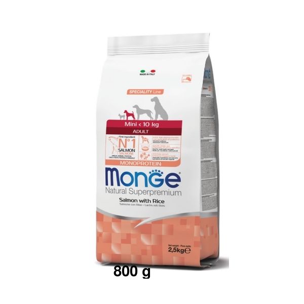 Monge Natural Superpremium Mini Adult Monoprotein* Salmone con Riso è un alimento completo per cani adulti di taglia mini.