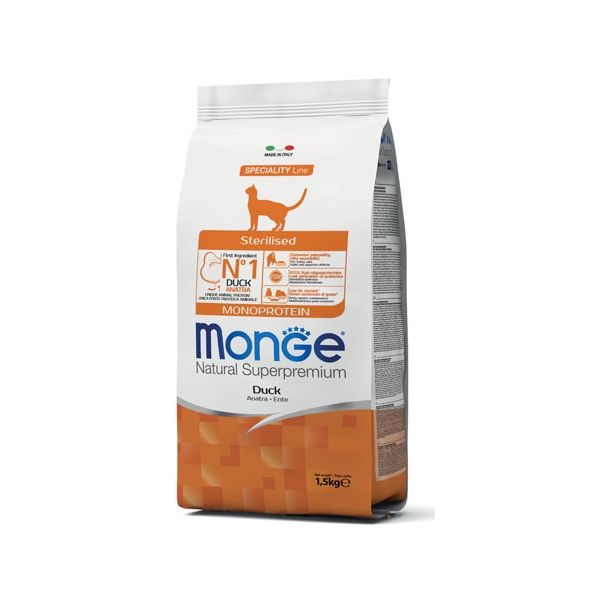 Monge Natural Superpremium Monoprotein* Sterilizzato Anatra è un alimento completo per gatti adulti.