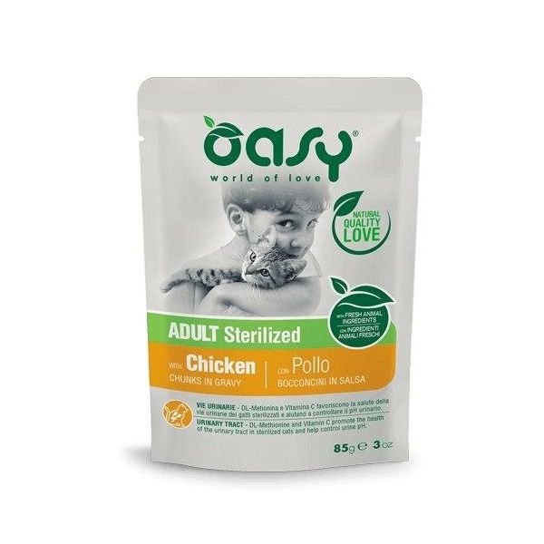 Teneri bocconcini con Pollo, specifici per gatti adulti sterilizzati. Alimento preparato con tante proteine animali e prodotto senza glutine aggiunto, senza aromatizzanti e coloranti artificiali.