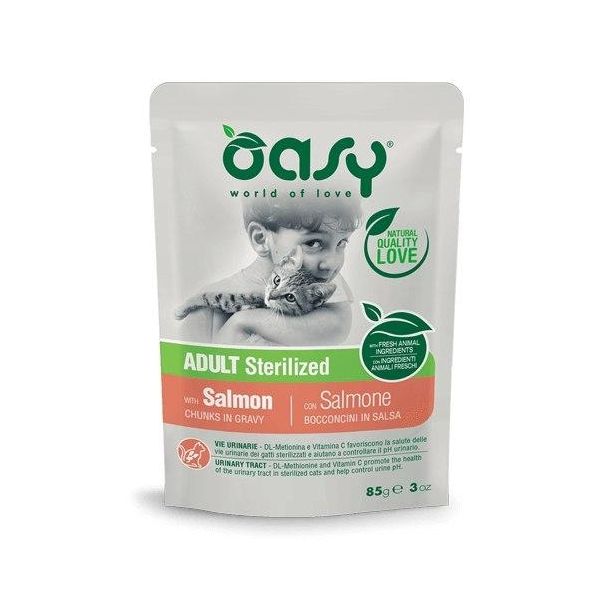 Teneri bocconcini con Salmone, specifici per gatti adulti sterilizzati. Alimento preparato con tante proteine animali e prodotto senza glutine aggiunto, senza aromatizzanti e coloranti artificiali.