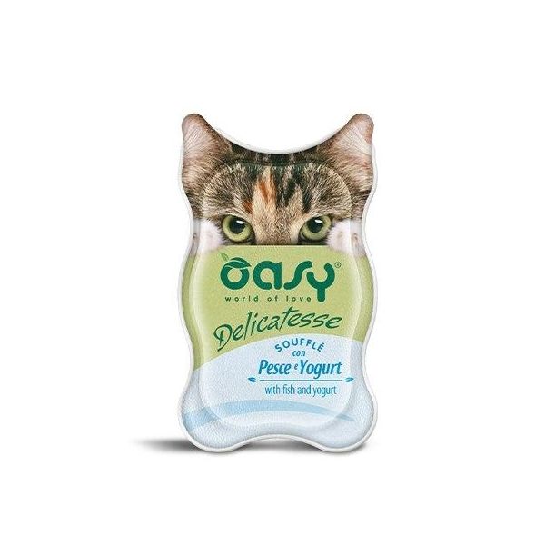 Cremoso alimento umido con Pesce e Yogurt, ideale per gatti che preferiscono consistenze tenere e delicate. La morbidezza del soufflé unita al cuore tenero di bocconcini lo rendono un pasto delizioso e nutriente.