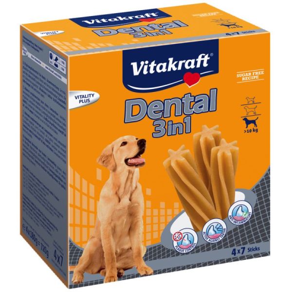 I deliziosi bastoncini dentali Dental 3in1 senza zucchero contengono un‘efficace combinazione di principi attivi: la sostanza Stay Clean™ riduce lo sviluppo dei batteri responsabili della formazione della placca; i pirofosfati aggiunti stimolano il calcio presente nella saliva e riducono la formazione del tartaro; la componente dello zinco previene la gengivite e contribuisce a sanare le lesioni della bocca.